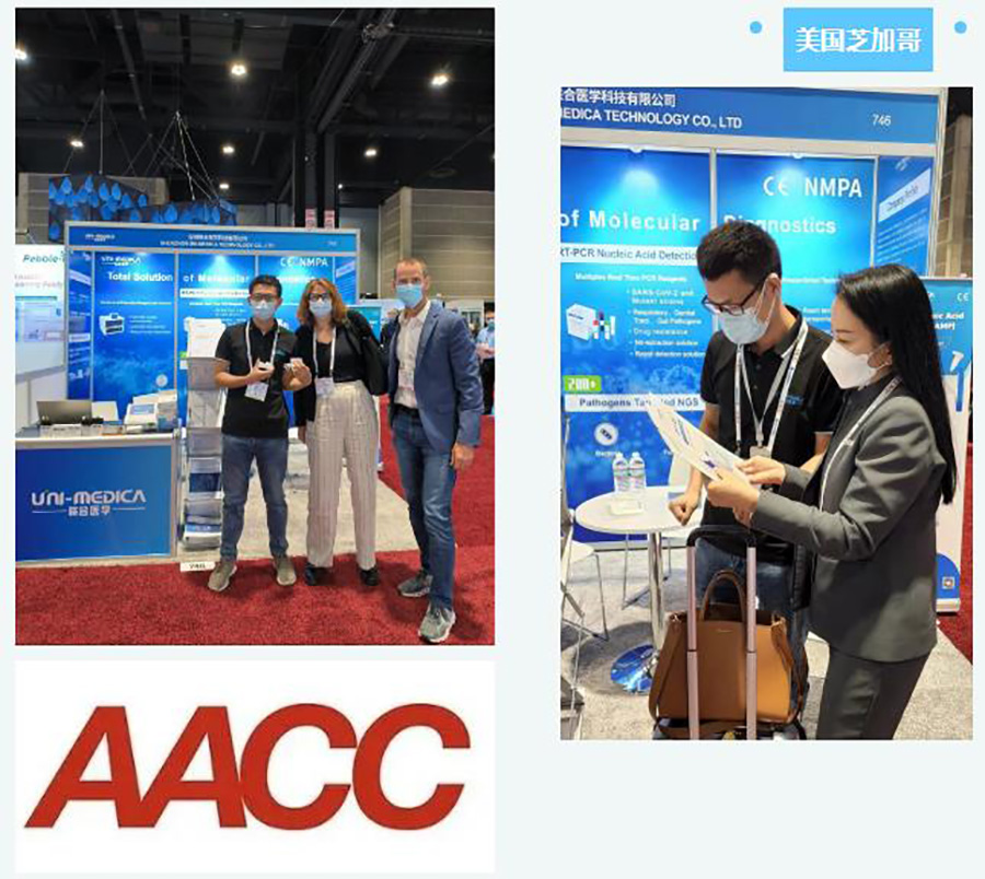 This time, AACC and Uni-medica carried lamp portable constant temperature amplification analyzer, POCT immunofluorescence analyzer, novel coronavirus detection whole process solution, TNGS pathogen targeted sequencing and other products to participate in the exhibition.