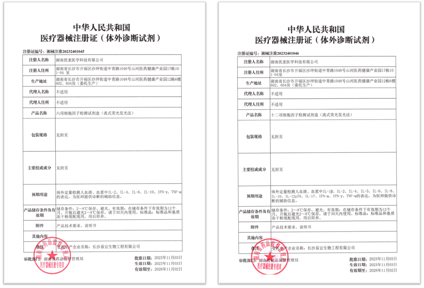 On November 3rd, Hunan Uni-medica (the subsidiary corporation of Shenzhen Uni-medica Technology Co., Ltd.) received the Class II Registration Certificate of Six Cytokine Detection Kits (Flow Fluorescence Luminescence Method) and Twelve Cytokine Detection Kits (Flow Fluorescence Luminescence Method) from the FDA Bureau, which marks a great achievement of Uni-medica in the field of flow cytometry.