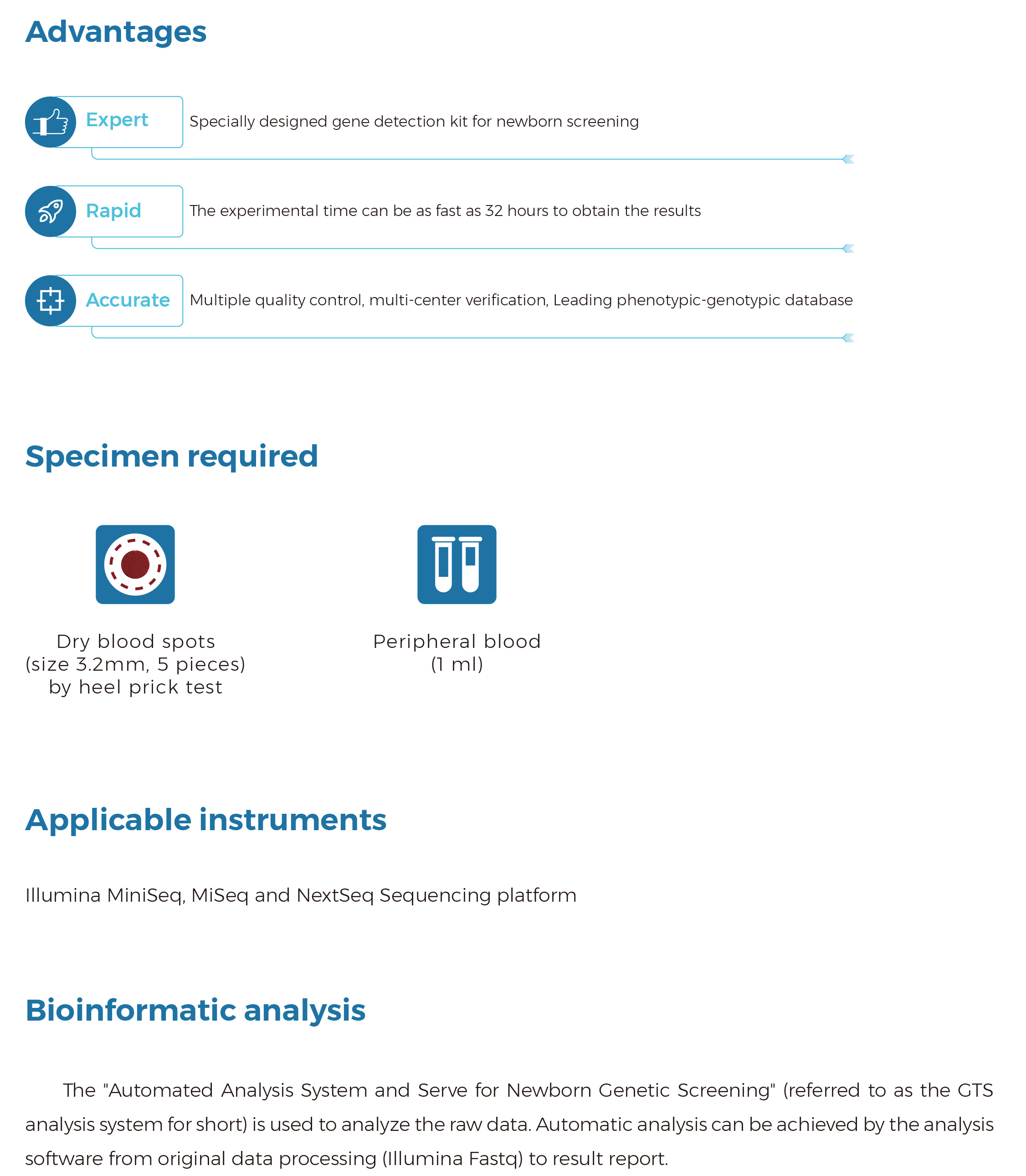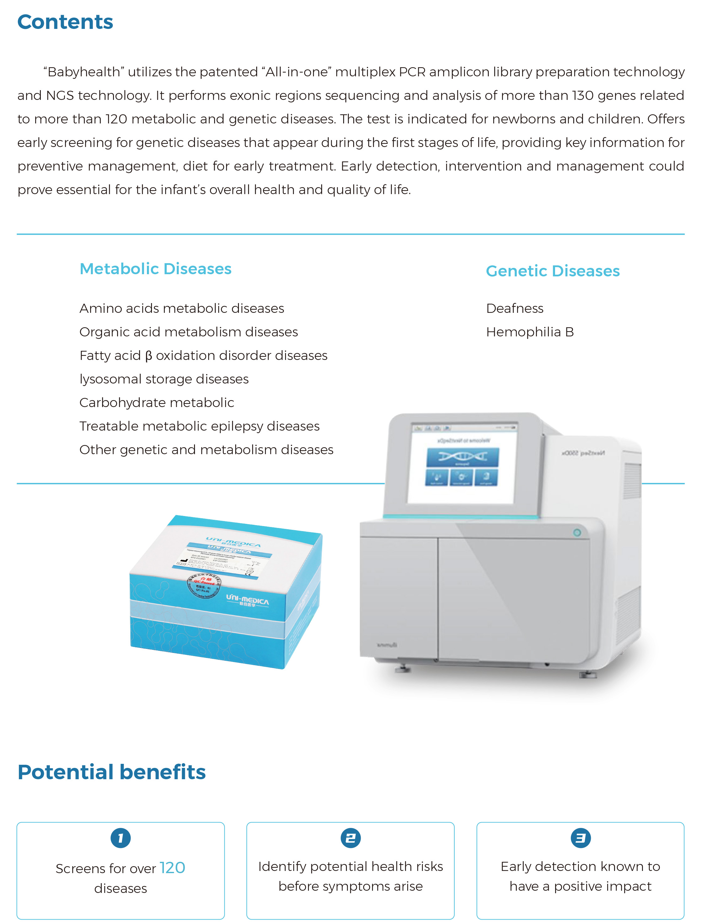 Uni-medica “Babyhealth” utilizes the patented “All-in-one” multiplex PCR amplicon library preparation technology and NGS technology. It performs exonic regions sequencing and analysis of more than 130 genes related to more than 120 metabolic and genetic diseases.