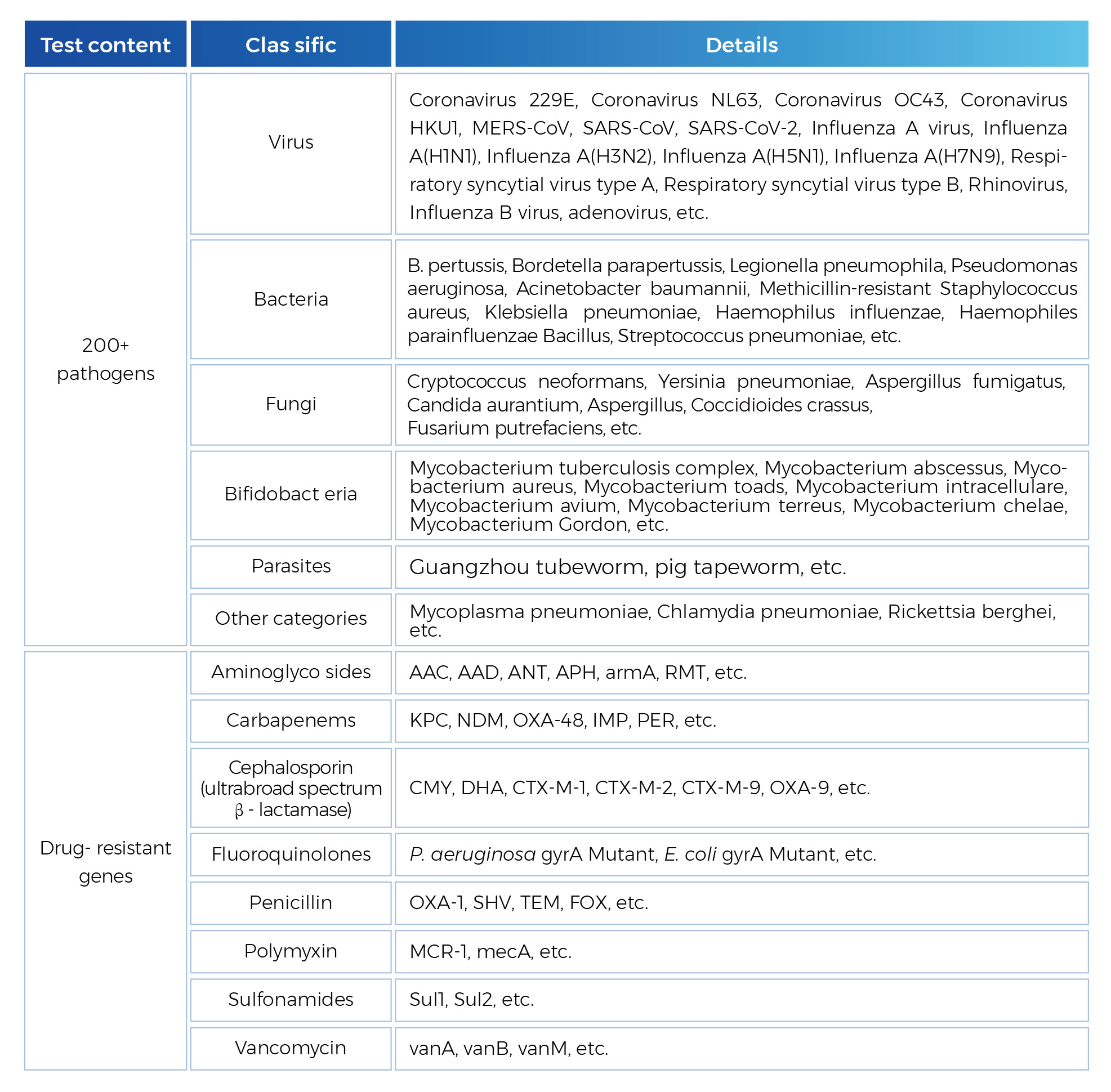 Uni-meidca pathogens targeted Next Generation Sequencing(tNGS), using the patented "All-In-One" ultra-high-weight PCR amplicon capture technology and next generation sequencing technology, high-precision detection of trace pathogens nucleic acids in samples, not only can quickly identify viruses,bacteria, fungi, parasites and other pathogenic Microorganisms, but also can detect multiple drug resistance genes, which can help the rapid identification and detection of pathogens.