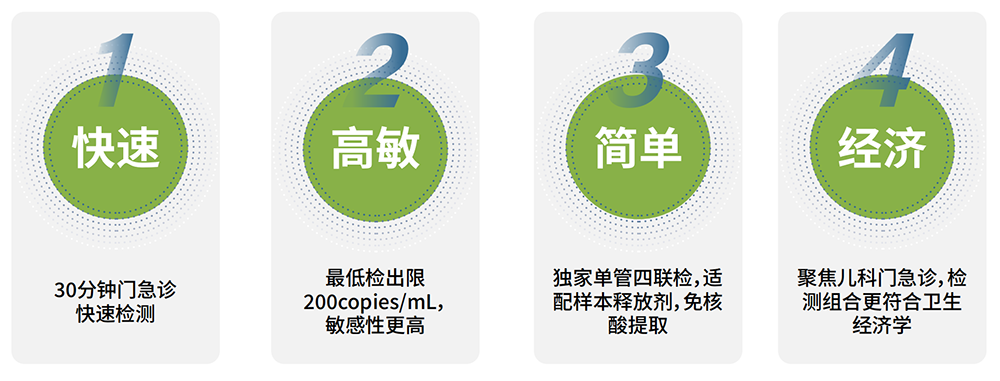 《人呼吸道合胞病毒感染监测与防控专家共识(2023年)》[3]推荐意见4、5中明确,推荐以地市为监测区域,选择综合医院和儿童专科医院作为HRSV感染监测哨点医院。门诊病例监测,选择哨点医院的发热门诊、儿内科门诊/急诊、呼吸内科、感染内科门诊;住院病例监测选择哨点医院的新生儿病房、儿内科、呼吸内科、ICU/儿科ICU、感染科、老年科和肿瘤科病房等。HRSV监测对象覆盖所有年龄段人群,以5岁以下儿童和≥65岁老年人为重点监测对象。5岁以下儿童年龄分组为新生儿(0~28d)、>28d~<1岁、1~2岁和>2~5岁。 除此以外,随着近期新冠病毒核酸检测阳性检出率的不断提高,在对呼吸道合胞病毒监测的同时,多项联检对于进一步明确诊断及用药调整,也有着十分重要的临床意义。 核酸快检既解决了免疫学方法灵敏度不足的问题,同时又解决了传统核酸检测时效性的问题,在呼吸道病毒感染高发的背景下能够更好地服务门急诊就诊人群,获得了专家组的广泛认可与推荐。深圳联合医学针对儿童门急诊病原谱流行病学以及疾病负担程度,选择发病率高且疾病负担高的四种病毒,包含甲流、乙流、新冠以及呼吸道合胞病毒,核酸检测采用高效聚合酶以及免提取核酸检测等技术,实现可适配常规PCR仪的核酸快检,不仅大大缩短检测时间,也大大缩短检测成本,门急诊30分钟完成核酸扩增检测,为门急诊患者提供准确的病原学检测结果,提供更精准的治疗策略。
