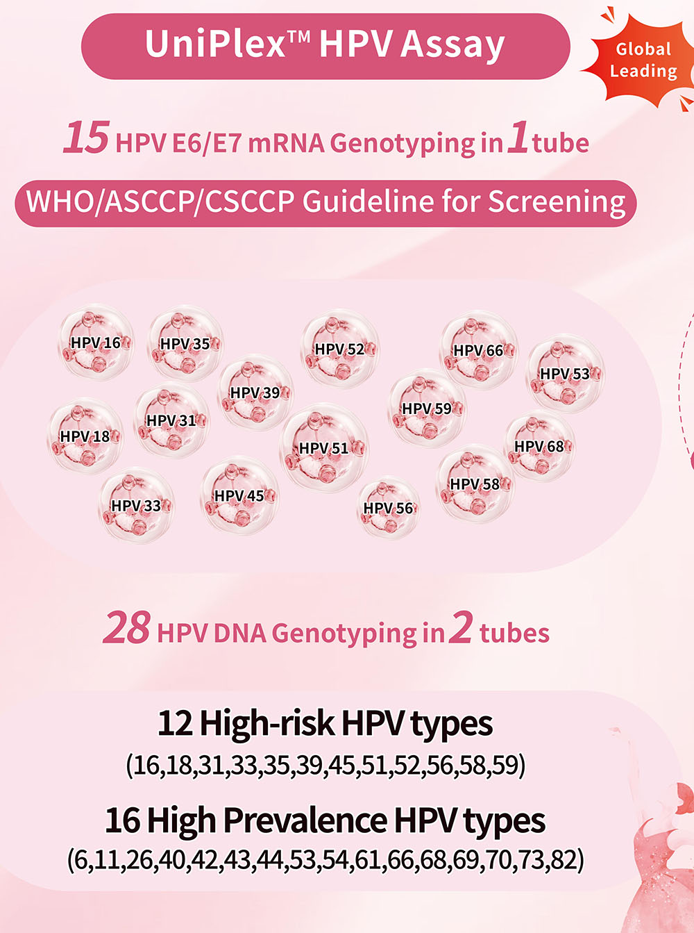 Uni-Medica's HPV E6/E7 mRNA Genotyping Detection Kit employs the fluorescent PCR melting curve method, enabling the simultaneous detection of 15 HPV E6/E7 mRNA subtypes in a single tube. Featuring a streamlined workflow, a well-established technical platform, and higher result accuracy, the kit stands out in clinical testing. Also showcased at the event is the dual-tube 28-type HPV DNA Detection Kit, which covers 12 high-risk subtypes and 16 high-prevalence subtypes. Together, these kits support the precise diagnosis and treatment of HPV-related conditions.